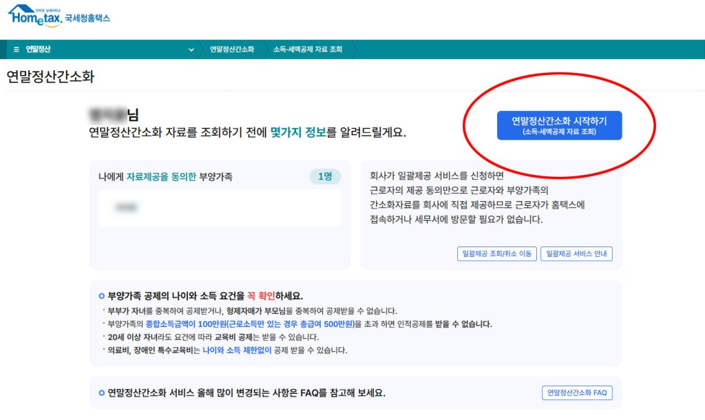 우측상단 연말정산간소화 시작하기 파란색 버튼을 눌러 자료를 조회한다.
