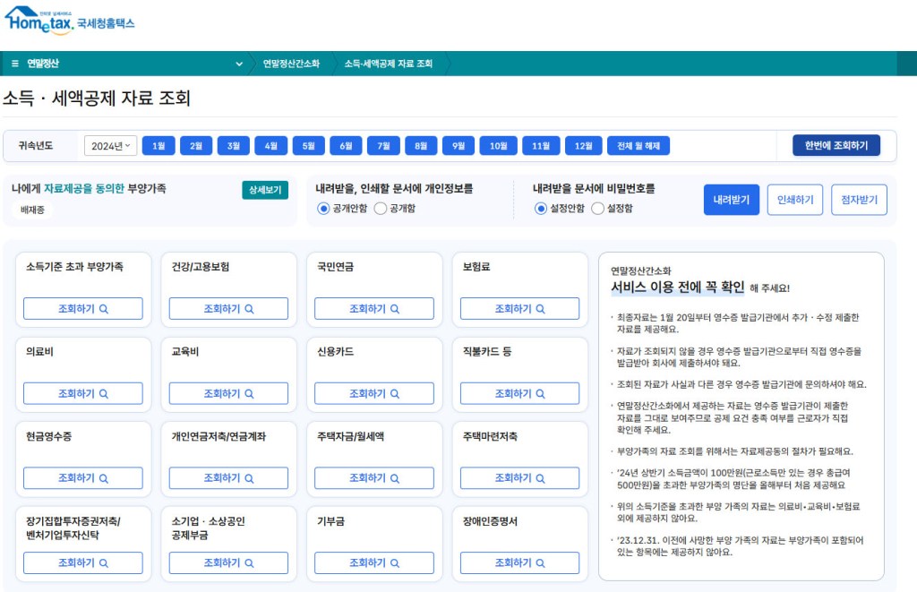 2024년을 귀년도로 하여 우측상단의 한번에 조회하기 버튼을 누르면 좌측으로 세부항목아래로 금액이 나타난다. 개인정보 공개 여부를 선택하고 제출된자료의 공유를 위해서 비밀번호는 설정안함으로 선택한다. 그리고 제출할 방식에 따라 내려받기/인쇄하기/점자받기를 선택한다. 그리고 나서 관련부서에 제출하면 된다.